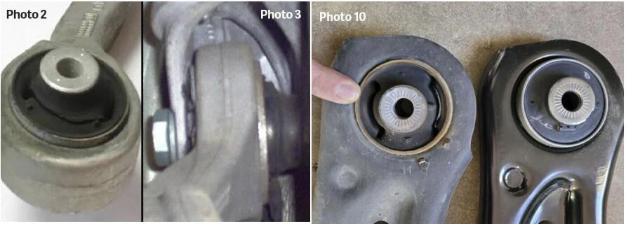 ● การสึกหรอของยางที่ผิดปกติ เช่น ขนหรือการสึกกร่อนมากเกินไปที่ขอบ ซึ่งเป็นผลมาจากการวางแนวที่ไม่ตรงอันเกิดจากการเล่นของบุชชิ่ง