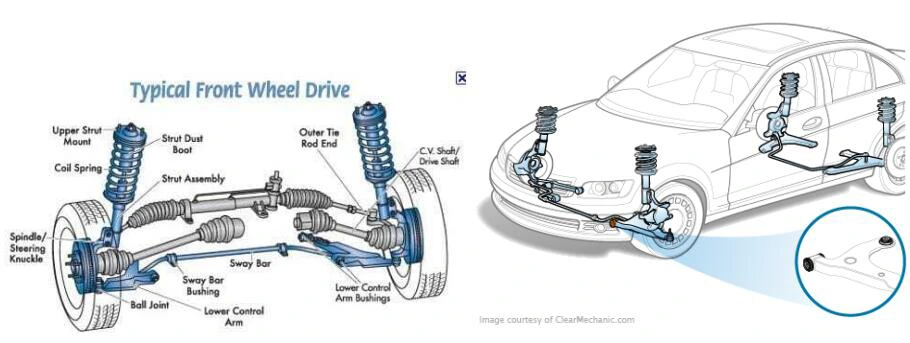 (ภาพประกอบและแผนภาพแสดงตำแหน่งบุชชิ่งทั่วไปในรูปแบบระบบกันสะเทือน)