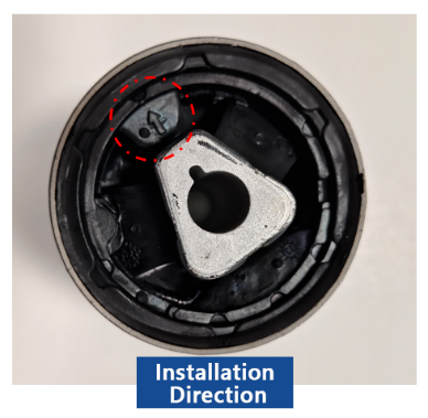 ระหว่างการติดตั้ง ตรวจสอบให้แน่ใจว่าส่วนแข็ง (ไม่แยก) ของบุชชิ่งอยู่ในแนวเดียวกับทิศทางการเคลื่อนที่ไปข้างหน้าในแนวนอนของยานพาหนะ หากบุชชิ่งมีลูกศรชี้ทิศทาง ลูกศรนี้จะต้องชี้ไปข้างหน้าในทิศทางการเคลื่อนที่